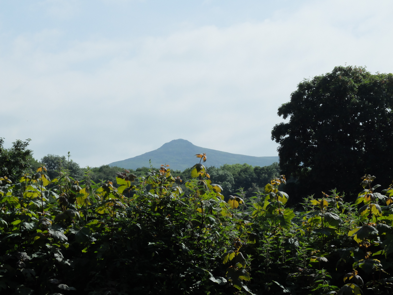 In leaving, we took one final look beyond the perimeter hedge, to see the now-familiar shape of Carningli, mountain of the angels, from which we had just come. Seen from this angle, you can see how high it is, and how it dominates the land around.