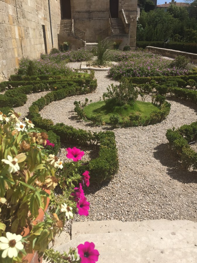 The cloisters are one of the few cool places, and lead down to the terraced garden which overlooks the canal-housing valley below.