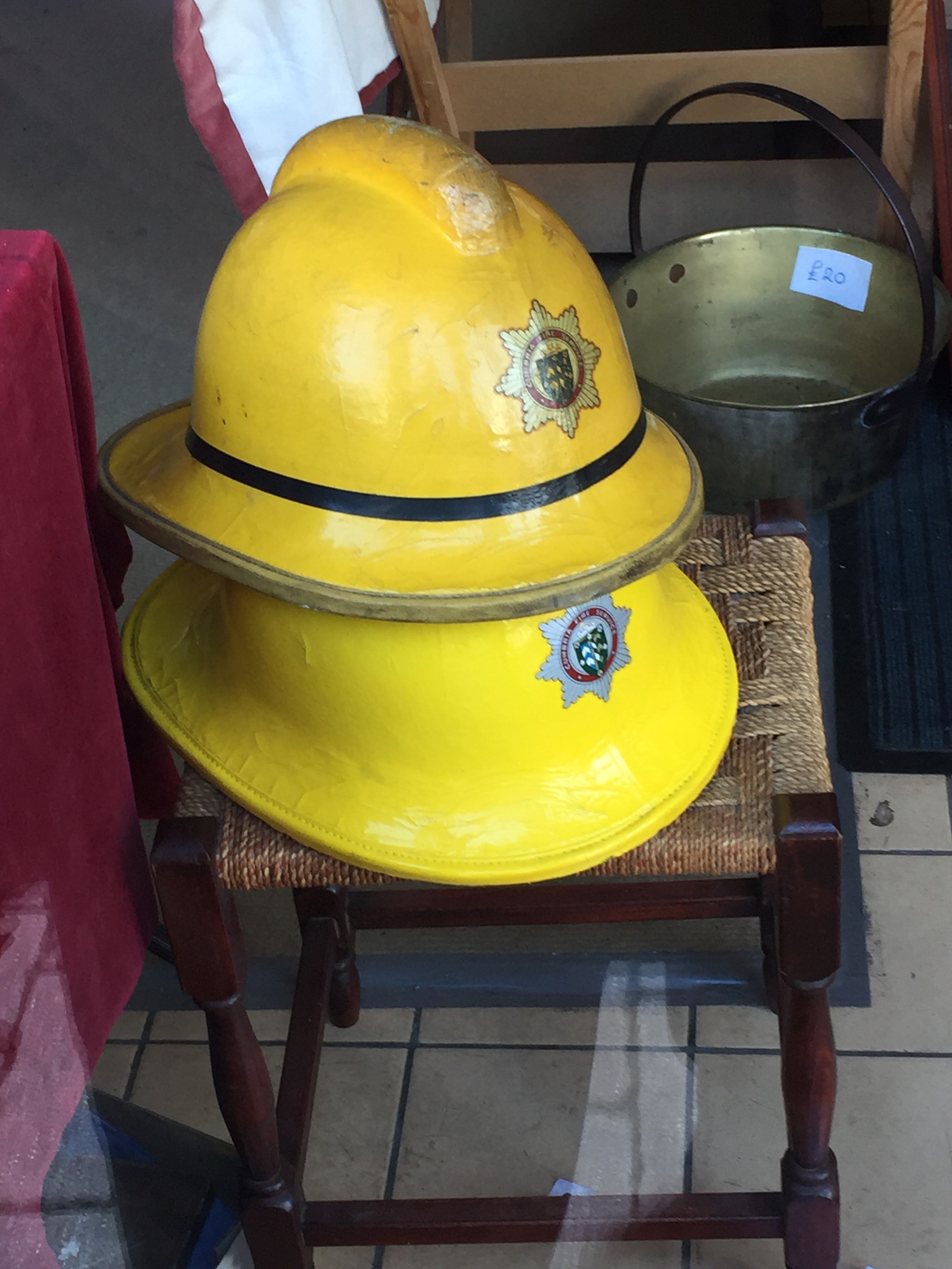 Two: Two old firefighter’s helmets in a curiosity shop. Wonderful!