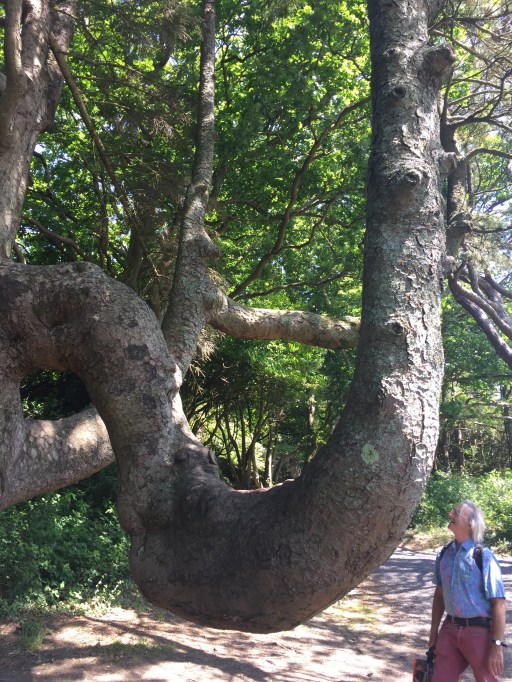 I have another photo of the two of them up a tree – the next item in our mosaic – but we have an agreement, usually honoured, that we will not publish photos without the subject’s approval. Instead, here’s a photo of the tree with John about to size up the possibility of sitting on its bent and horizontal trunk. For the second day in a row, our chess champion was about to contribute some mystically-themed reading, many of which he recited from memory.
