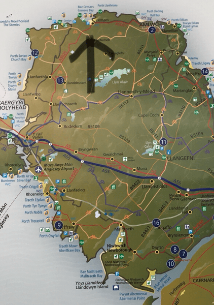 My annotated Anglesey photo (above) from the tourist information board at the tiny seaside village of Camaes Bay shows the location of this beautiful stretch of coast, which boasts that it is ‘the most northerly village in Wales’.