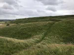 (Visitor board image of the entire Maiden Castle site, regarded as Britain’s finest example of an Iron Age hill fort. ©English Heritage)