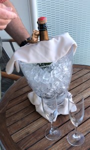 We can hear very little. With perfect timing, our steward has entered the cabin and presented us with an ice-bucket holding our complimentary bottle of champagne and two flutes. I can’t resist taking it out to the balcony and popping the cork – discretely – allowing us to toast the lovely city to which we are now saying goodbye. We may be back, but you never know. It’s a long way from home and we hate leaving our beloved cat and dog for so long.