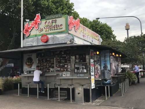 The Colonel’s faded picture is mounted on the silver walls of an amazing creation in front of us called Harry’s Cafe de Wheels… There’s a story to the name which we’ll get to in a moment. First, though, I have to convey something about the place in which this pie-selling time machine lives…