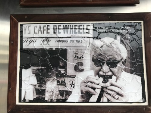 In the old black and white photo, the colonel is eating… a pie. He’s more associated with Kentucky’s fried chicken, but here it’s a pie. It was taken a long time ago (1972) and the iconic fried chicken man is clearly enjoying himself doing something different.