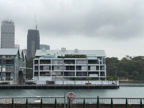 Russell Crowe lives here. At the end of the old cargo pier is a most expensive part of the waterfront, where the actor’s penthouse (below) is reported to have cost AUS$25M… Beyond his dwelling is a glimpse of the CBD – Central Business District; every Australian city seems to have one. Through the trees in the right foreground is a really good view of the Sydney Opera House, which will feature in other posts.