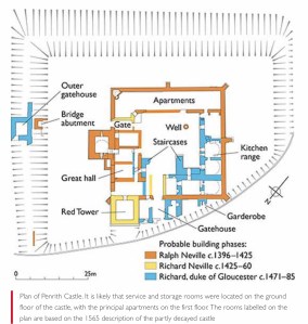 (Above – a plan of the interior of Penrith Castle as it was in the 15th century. ©English Heritage and photographed from their information board)