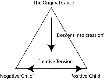 The diagram above shows the process whereby something of a ‘higher nature’, spiritually, divides itself into two ‘children’ in order to come into manifestation at a ‘lower’ level. This is a deeply mystical idea and is the basis of most of the world’s metaphysical thought.