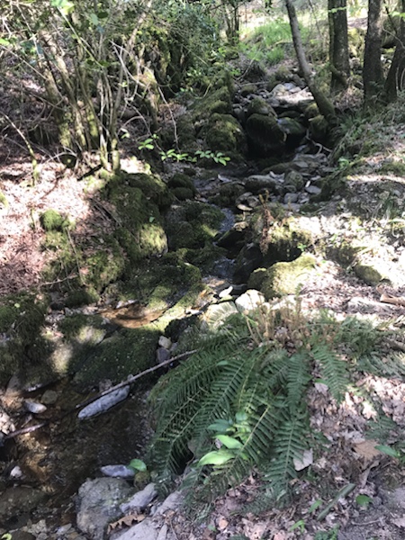 From the rustic wooden gate, the path winds up to the right and begins to follow the stream valley that climbs the hill. This forms the core of the garden.