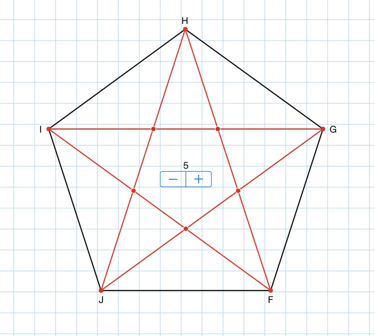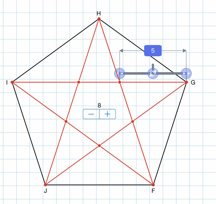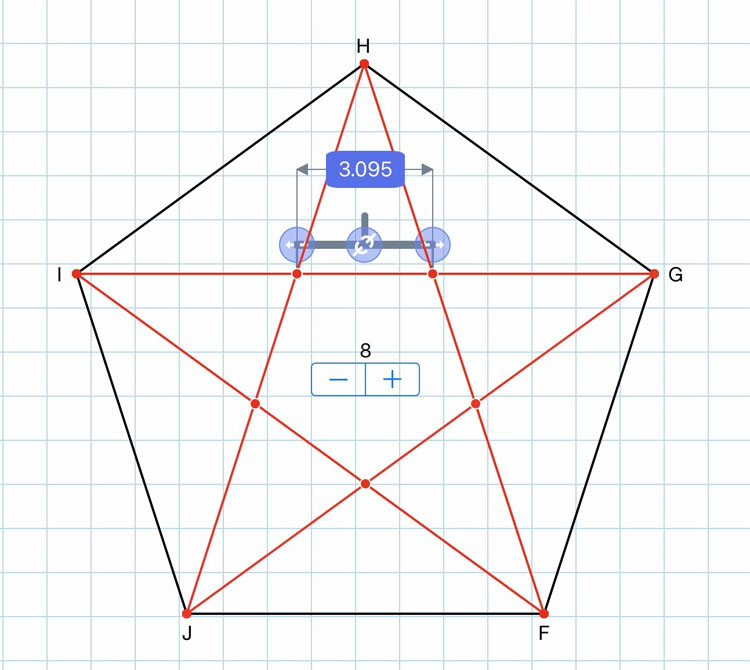 Look at the line running from G to I. It has three divisions caused by the intersections with the other vertices. From Figure Four we see that the distance from G to the first intersection is 5 units. Figure five shows us that the next section is of length 3.095 units. Allowing for the slight inaccuracy of the graphics we can divide the smaller by the larger and get 1.618, which is the value of Phi – the Golden Section.