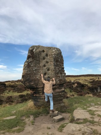 It is still used by local folk as a rite of passage. Those who seek the hand of marriage with the girls and ladies of the nearby town of Baslow are expected to demonstrate their suitability by climbing the stone unaided. It’s not a trivial ascent, as this second shot of the rock shows: