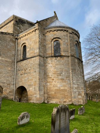 (Above: The beautiful St Peter’s church in Heysham has strong similarities with St Oswald’s at Lythe, including the presence of an impressive Viking hogback stone. Note that this church is also built on a headland – the sea is visible in the right background of the photo)