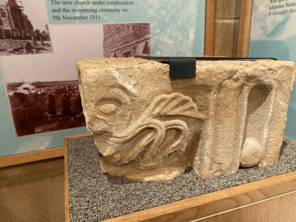 The medieval sandstone coffin was restored in 2007 by York Archaeological Trust laboratories. The coffin was air-dried before cleaning and re-assembly of the three broken pieces using steel dowels and conservation-grade adhesives. The image below, taken at the St Oswald’s museum, shows its original state before restoration. Looking at this, we can glimpse the work the local team have carried out over generations to provide a vehicle for the understanding and retention of the deep history of this part of North Yorkshire.