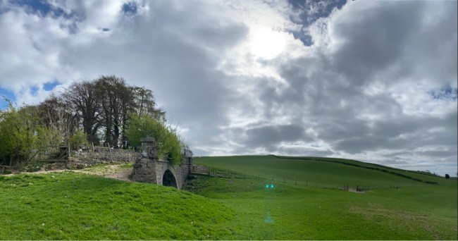 Eventually, after another five minutes’ walking, we come to one of our most iconic and mysterious structures: a ‘bridge to nowhere’ that crosses a canal that is no longer there. In this view you can see what happened to the canal along most of its length; it was sold off and filled in to create agricultural fields – as it was with the piece that is now our garden.