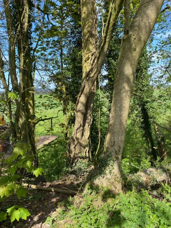 For now, let’s climb out of the old canal bed, through the gate and up onto the original canal path – still in use as a footpath and right of way. The immediate area is heavy with trees which follow the steep bank down to the adjoining farmland.