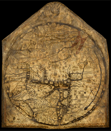 (Above: the Hereford Mappa Mundi, with Jerusalem and the east, at the top of the map, Source Wikipedia, Public Domain)