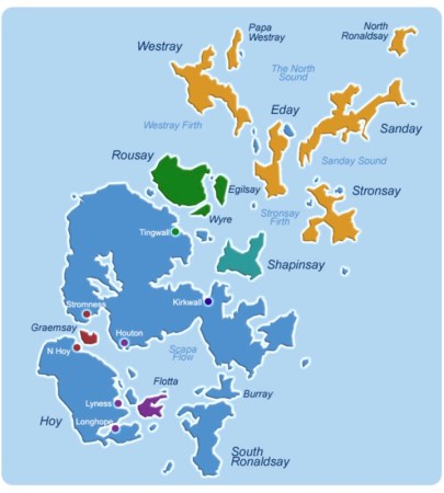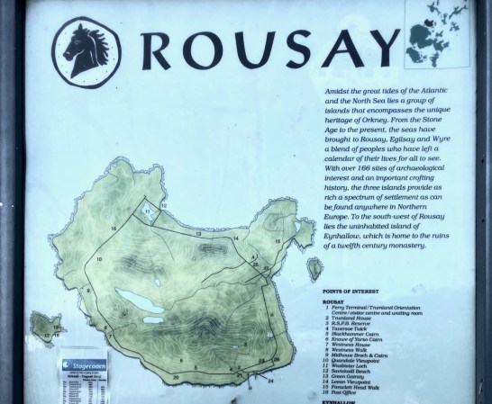 I must have missed that when we booked the tickets for our day trip to Rousay; one of the islands north of the Orkney ‘mainland’, shown in green on the ferry company’s map below. The ferry service is used mainly by locals – it’s their lifeline to the outside world.