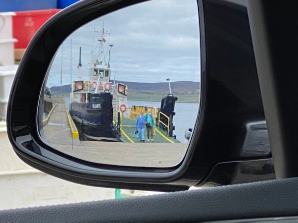 The car in front is really the one behind, because we were all facing backwards to our normal direction of travel… We were doing that because we had to back our cars onto the small boat to allow for easier disembarkation.