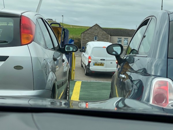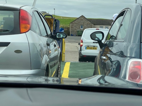 I stared as the car behind me literally disappeared into the gloom of the lower quayside… Then there was a bumping noise and it reappeared climbing backwards onto the boat, making it look simple. “He’s probably done it a thousand times,” I muttered…