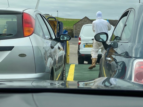 I can’t show you photos of my own descent… I was rather busy. The middle of the boat’s loading platform had appeared, mercifully, right in the middle of my green lines of safety. I pressed on, conscious that the man in white with blue hands was probably finding fault. No sooner had all four wheels clunked on board than he appeared in my lowered window, apparently less impressed than I was with my arrival on his vessel.