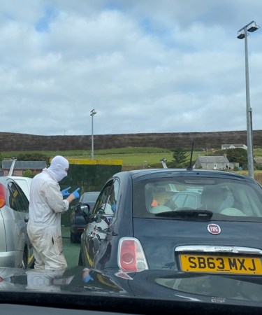 The sinister man in the white overall was tall and very athletic. He’d just talked me through what was going to happen next – punctuated by rapid movements of his blue gloved hands. I was still shocked and not sure I’d heard correctly, so in the photo I’m watching carefully as he explains things to the car ‘in front’. My one salvation was that I wasn’t to be the first car to attempt this treacherous descent… I would be the second…