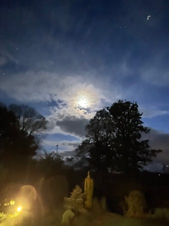 The onset of night need not spell the end of taking photos. Many cameras now have a ‘night mode’. Even hand-held, as above, the effects can be rewarding. The shot was taken at about two in the morning, when the collie got me up for her toilet. She doesn’t always need this, but I was glad she did on this night…a silver lining, indeed!
