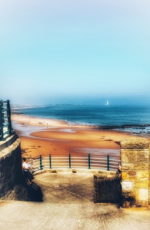 While she was queueing, I strolled quickly back to try the possible photo I’d seen. Two women were talking across a gap on the edge of a set of steep downward steps. Beyond was a panoramic view across the beaches and sea towards the distant St Mary’s lighthouse. Even in the bright sunlight of a pristine September day, it didn’t look as emotionally warm as it felt; so I took the shot with a view to editing it in a new (free) App I’d been recommended called Snapseed, made by Google.