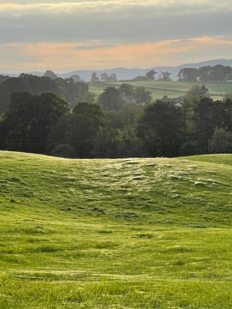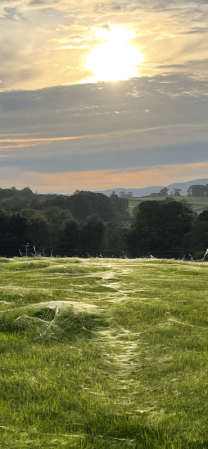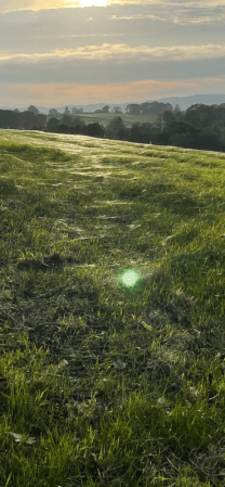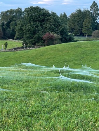 The webs were ‘sheet-webs’ and created by thousands of tiny money-spiders. The season has been mild and so this is happening later than normal.