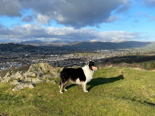 (Tess, the Collie, expressing a preference as to how we navigate The Helm. In the distance are the major hills of the central Lake District)