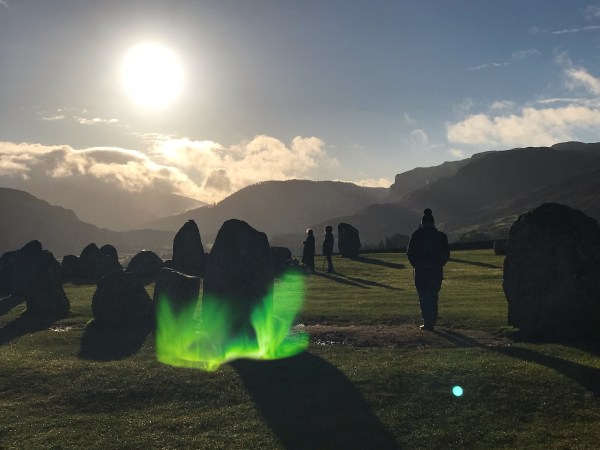 Back at Castlerigg, I pointed at the nearby hills and the secondary edge where we would have stood to look down on where we were, now. You can just imagine our ghostly presences waving…