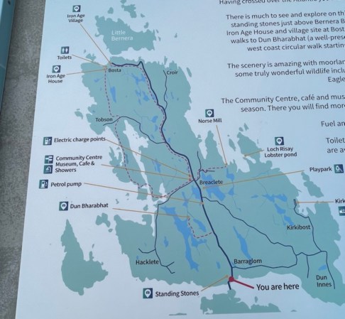 ‘Having crossed over the Atlantic you are now standing on the beautiful island of Great Bernera. There is much to see and explore on this small island, starting with the unique semi-circular standing stones just above Bernera Bridge here at the southern end, and ending with the Iron Age House and village site at Bosta Beach in the north.