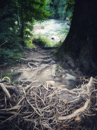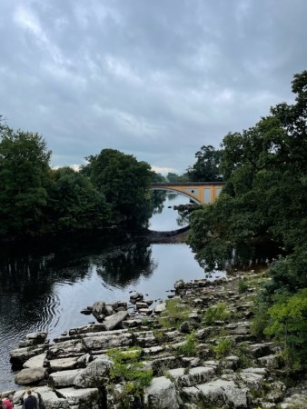 The way down to the River Lune is steep and treacherous. People jump off the bridge into the river, here…