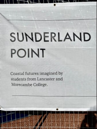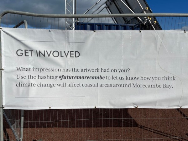 The strange object turns out to be a mixture things: there is the shiny new tidal radar station, but its protective fence is also being used as a temporary art exhibition to show the ecological work of local students of Lancaster and Morecambe College.