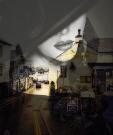 Immediately, I could see that ‘wedge of light’ of the model’s skin under the hat and above her society-event dress was a lucky fit for the slanting angle of the pub’s roof.