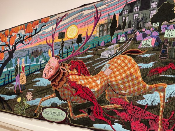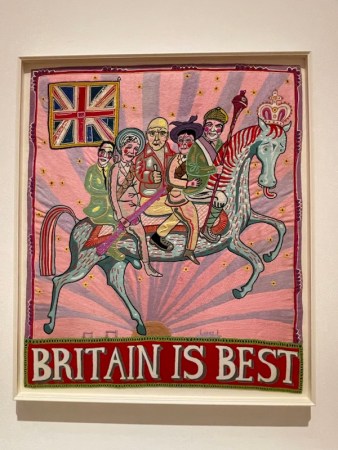 Perry describes Britain is Best as originating from a television programme he made in 2014, in Belfast, called Who Are You? As part of this a group of the production team, including Perry, went to see a march celebrating the 100th anniversary of the Ulster Volunteer Force. Perry interviewed five Unionists and this resulting embroidery depicts them all riding one horse. The image was based on a an existing mural of King Billy painted onto a gable end of a house in Belfast. Perry observed that they ‘seemed to be holding out for an imagined golden age.’