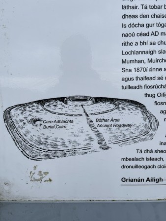 An ancient roadway ran up to the site (see above). There is a holy well, dedicated to St Patrick to the south of the stone fort and the site of a burial cairn to the east.
