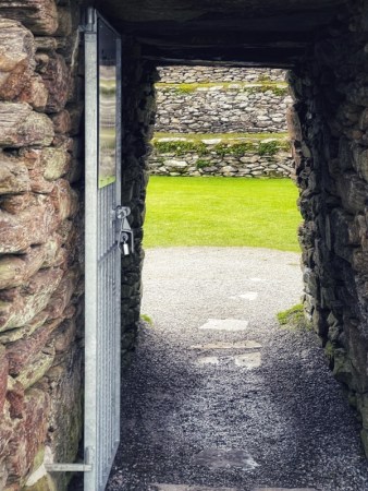 Within the wall are two wall chambers which stop short of the entrance. In 1935 the archeologist George Petrie recorded a rectangular stone building in the centre which is no longer standing.