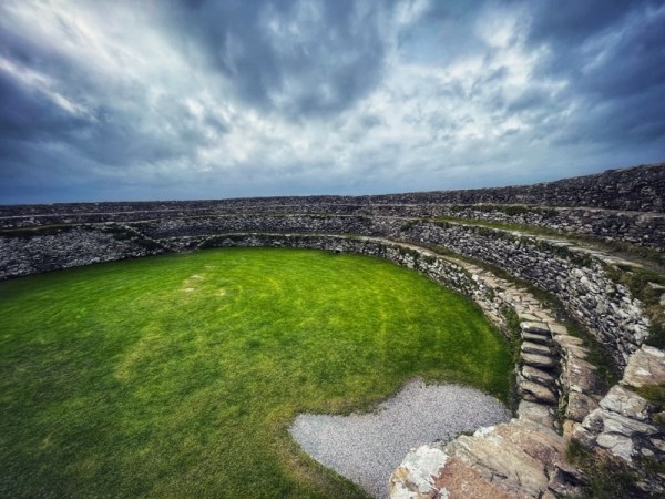 The lintel-covered entrance in the cashel leads into an interior enclosed by a wall that rises in three terraces and is accessible by inset stairways.