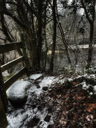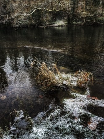 (Above: beneath the bridge is a river bank. The dusting of snow creates temporary objects that can lead the eye out to a larger composition. The River Kent looking dark and moody at this time of year)