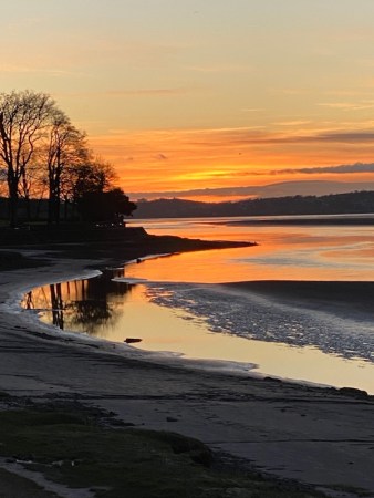 Shortly thereafter, with the car warming up further along the promenade, so we can watch the energetic tide race in or out, often twinkling with the light of Grange – across the estuary, while we eat our meal in hungry silence.