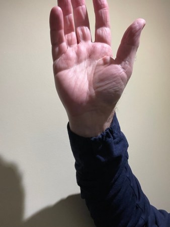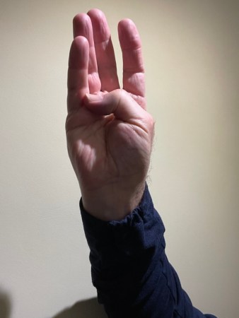 The ‘cold-blooded’ reptile is concerned only with survival. Above that and closely coupled with the spinal column is the mid-brain – the palm of the hand, below, with the odd structure of the folded thumb.