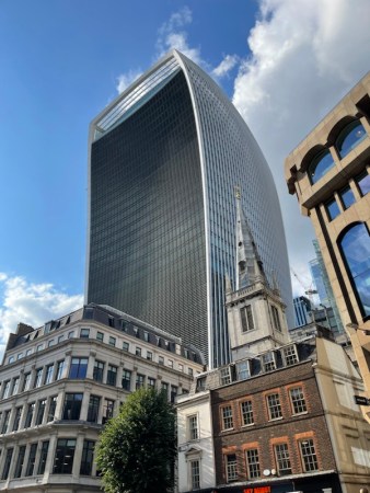 (An astonishing building. – beautiful inside – that dwarfs and diminishes its neighbours on the outside: the City’s ‘Walkie-Talkie building, otherwise The Fenchurch Building.)