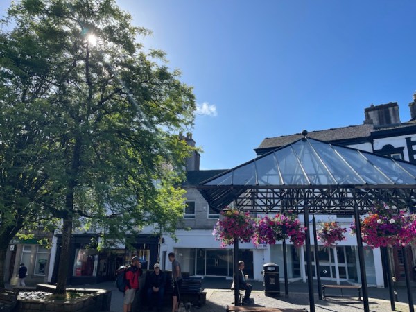 (Market Street descends – in stone cobbles – towards the River Kent. We get off the stop before)