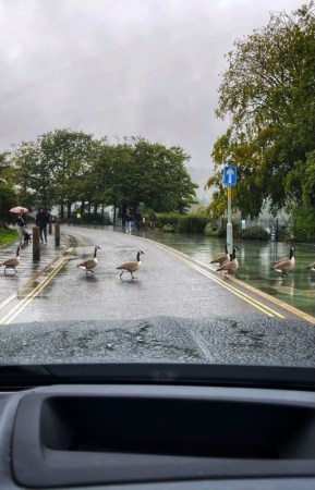 I stopped, of course. The lead goose turned its head to examine me through the rain … and nodded at me. I gazed in silent admiration as the whole flock followed in military precision. Thankfully, my phone was in the breast pocket of the raincoat I was wearing. The car was stationary and I managed to fumble it out halfway through the flock’s crossing, as you can see from the photo.