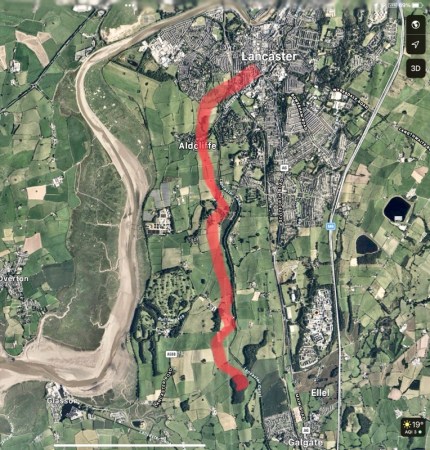 The Aldcliffe district of Lancaster now opens up on the right hand side of the opposite path. This follows the line of the canal down towards Glasson Dock – and the sea.