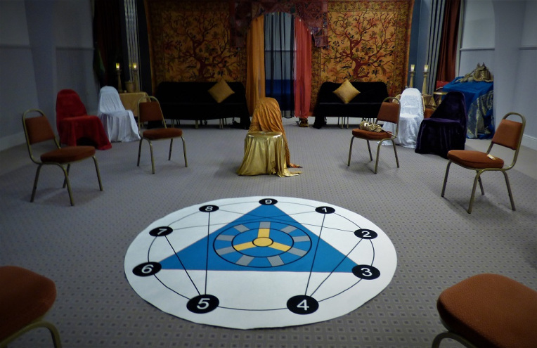 Alone, but knowing they follow, I cross the centre of the exotic floor and move towards the east of the temple. The gold-draped chair is waiting. I turn and stand, watching the precise formation of Fate Dancers peel away left and right, to literally flow down the circumference of the large circle that is the enneagram; the heart of this temple of the mysteries.